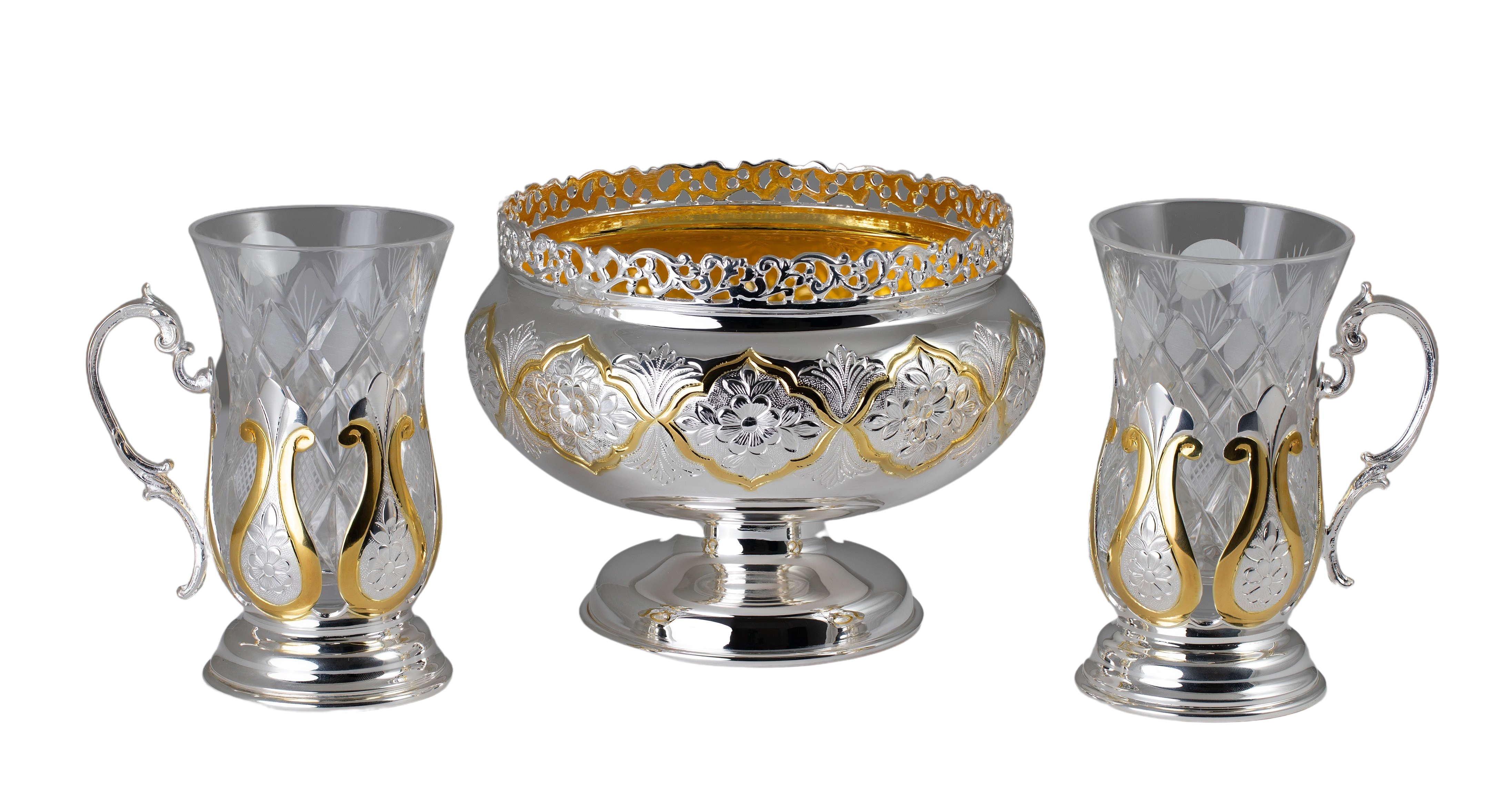 Bir masa ətrafında özəl günləri qeyd etmək ömür boyu insanın yaddaşında şirin bir xatirə kimi qalır. Qonaqlarınıza bu xatirələri bir daha gözəl yaşatmaq üçün incə, estetik, gümüşdən hazırlanmış stəkanaltı və konfet qabı dəstini təqdim edirik. Sənətkarlarımızın hazırladığı bu sənət əsəri öz zərifliyi və cazibədarlığı ilə sizi heyran edəcək.