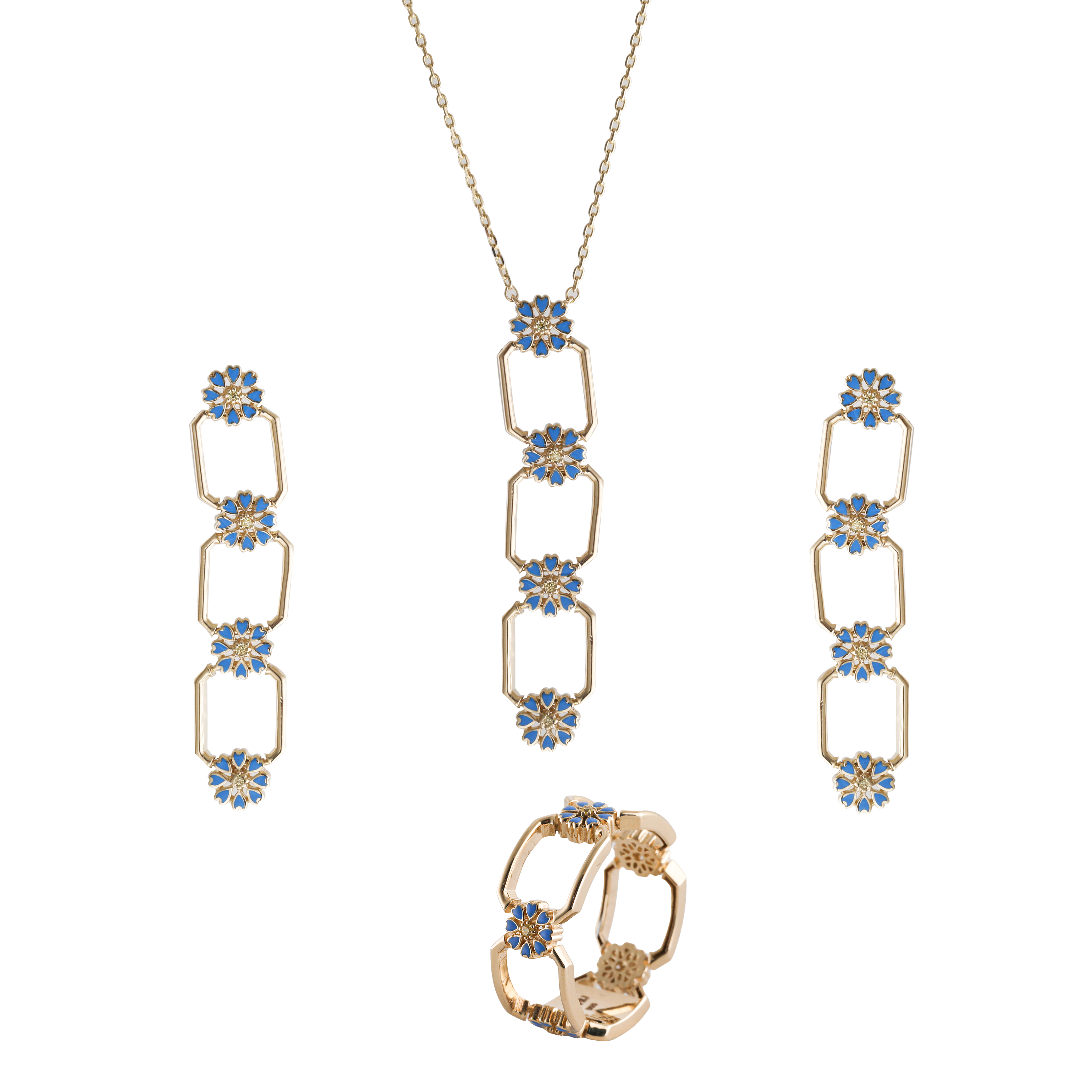 Bu zərgərlik dəsti boyunbağı, sırğa və üzükdən ibarətdir. Məmulat zərif qızılı formalar və mavi mina elementləri ilə bəzədilmişdir. Zərif kompozisiya və incə işləmə üsulu dəstə xüsusi estetik dəyər və eleqant görünüş bəxş edir. Dəst yüksək zərgərlik sənətkarlığı ənənələrinə uyğun olaraq hazırlanmışdır.