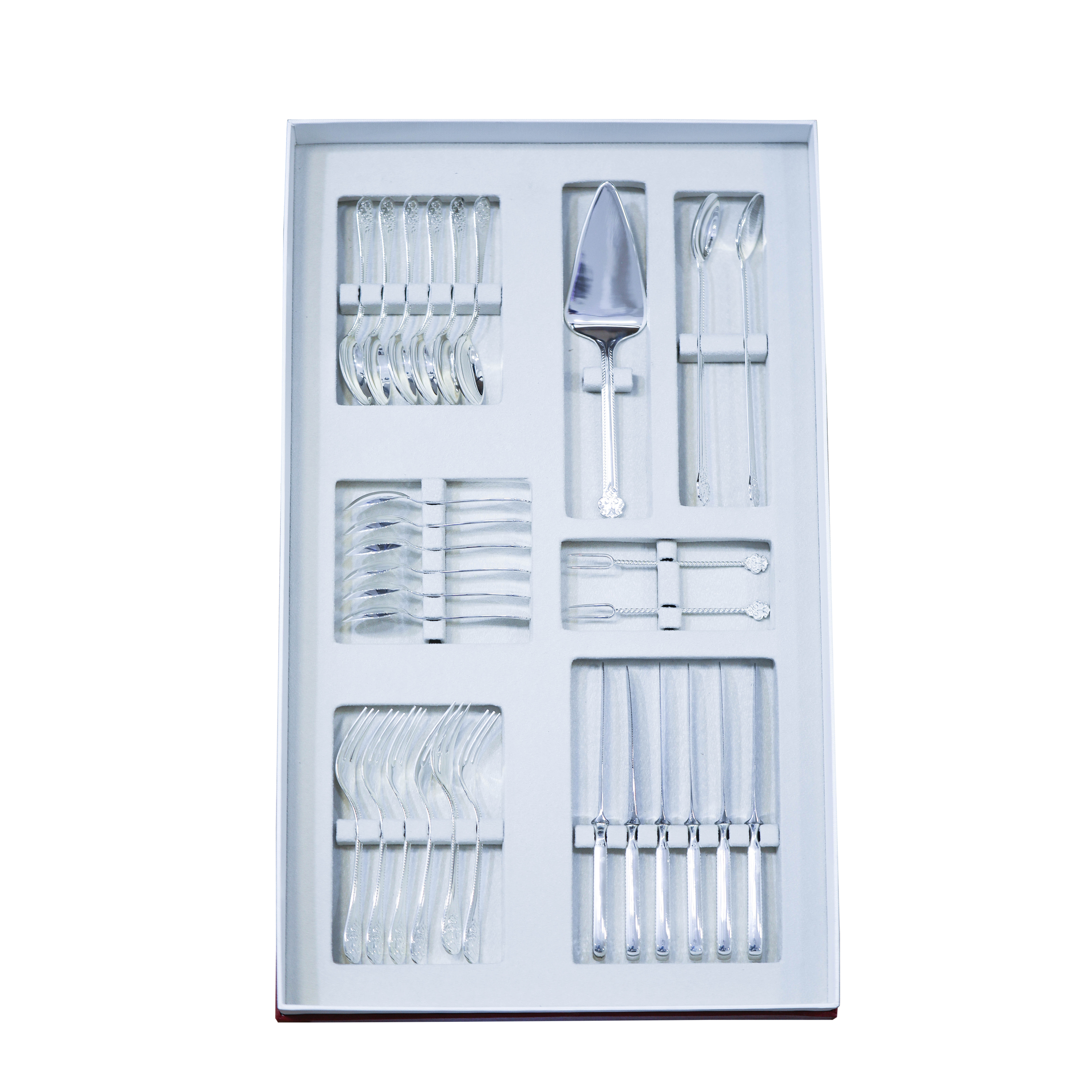 Desert üçün nəzərdə tutulmuş çəngəl, bıçaq, qaşıq və limon çəngəli dəsti zərif süfrə mədəniyyətinin vacib bir hissəsidir. Gümüşdən hazırlanan bu dəst, özəl desertlərin dadını çıxarmaq üçün xüsusi hazırlanmışdır və hər bir element rahat istifadə üçün düşünülmüş dizayna malikdir.
