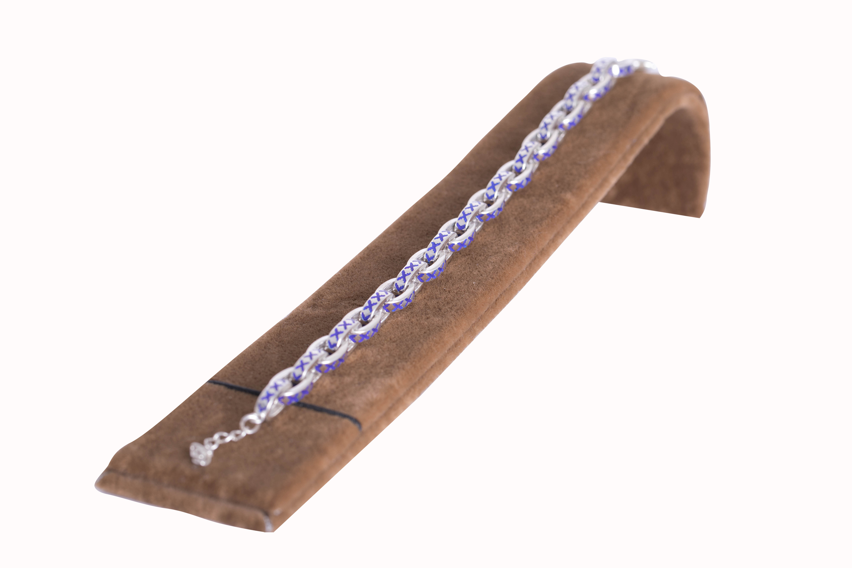 Gümüşdən hazırlanan bu zinət əşyası parlaqlığı ilə diqqəti üzərinə çəkir. Gördüyünüz bu qolbaq ''almaələn'' bala haşiyələri ilə bəzədilmişdir. Bu bala haşiyələri demək olarki, bütün xalçaçılıq məktəblərinin sevərək istifadə etdiyi, əsasən, Quba və Dəvəçi xalçaçıları tərəfindən geniş yayılmış haşiədir. Üzərindəki göy rəng inamın və sədaqətin simvoludur.