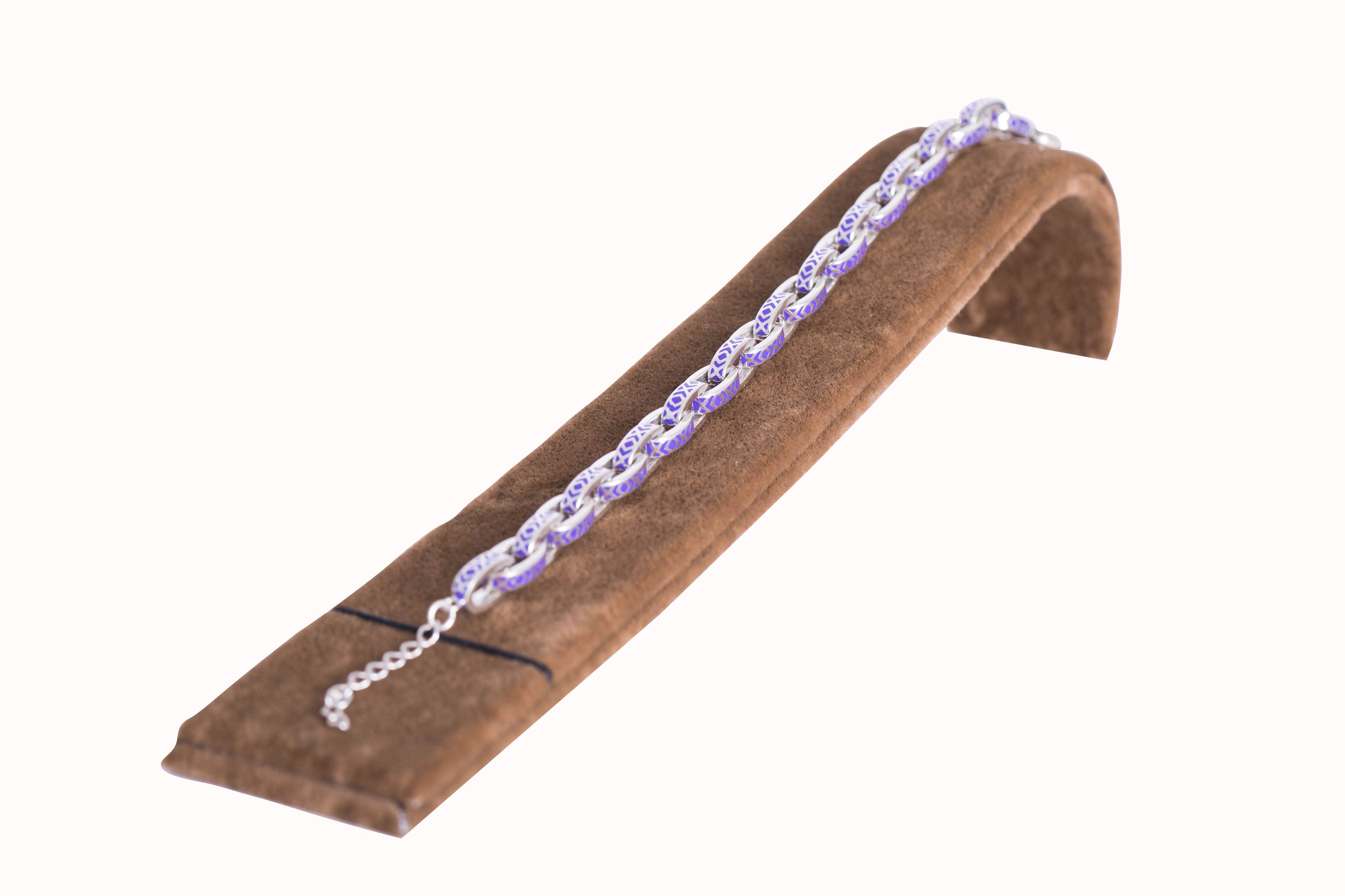 Gümüşdən hazırlanan bu qolbaq sadəliyi və parlaqlığı ilə diqqət çəkir. Həm xanımlar həmdə, bəylər tərəfindən istifadə edilə biləcək qolbaq həndəsi naxışla dizayn edilmişdir. Bu zinət əşyasının üzərindəki bənövşəyi rəng zərifliyi və zənginliyi tərənnüm edir.