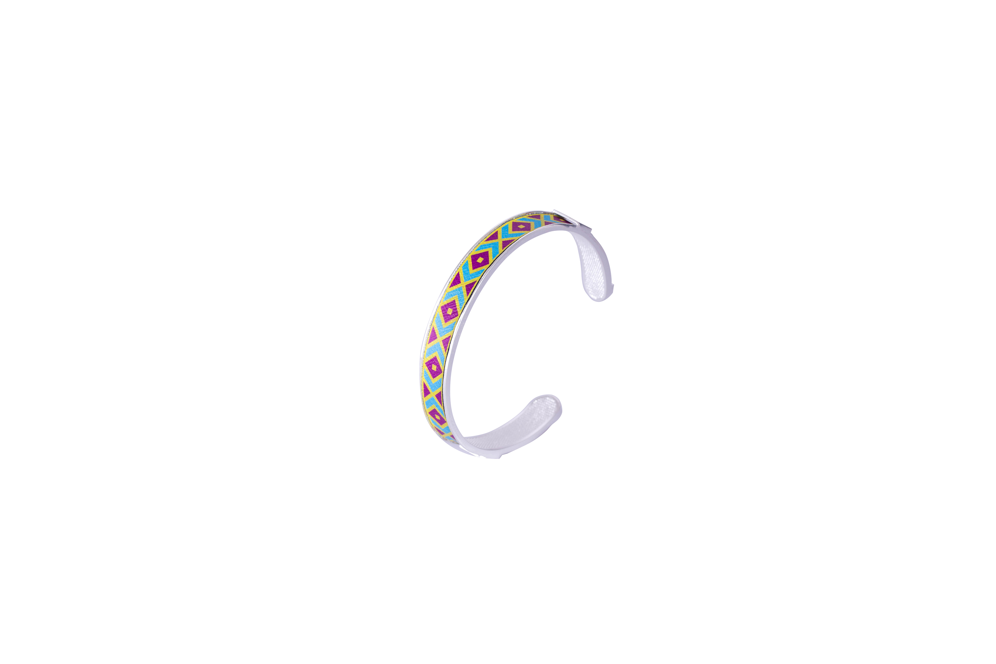 Gördüyünüz bu zinət əşyası özünəməxsus dizaynı və rənglərin ahəng ardıcılığı ilə diqqətləri üzərinə çəkir. Təqdim etdiyimiz qolbaq həndəsi naxışla dizayn edilmişdir. Bir çox həndəsi naxışlar dairələrdən, kvadratlardan və romblardan ibarət olur. Onların təsvirləri təkrarlanır, üst-üstə düşmüş mürəkkəb və kompleks nümunələr yaratmaq üçün bir-birilərinə bağlanırlar. Rənglərə gəldikdə isə, sarı rəng rahatlığı, fərahlığı və aydınlığı, mavi rəng inam və sədaqəti, bənövşəyi rəng isə, zərifliyin və zənginliyin simvoludur.