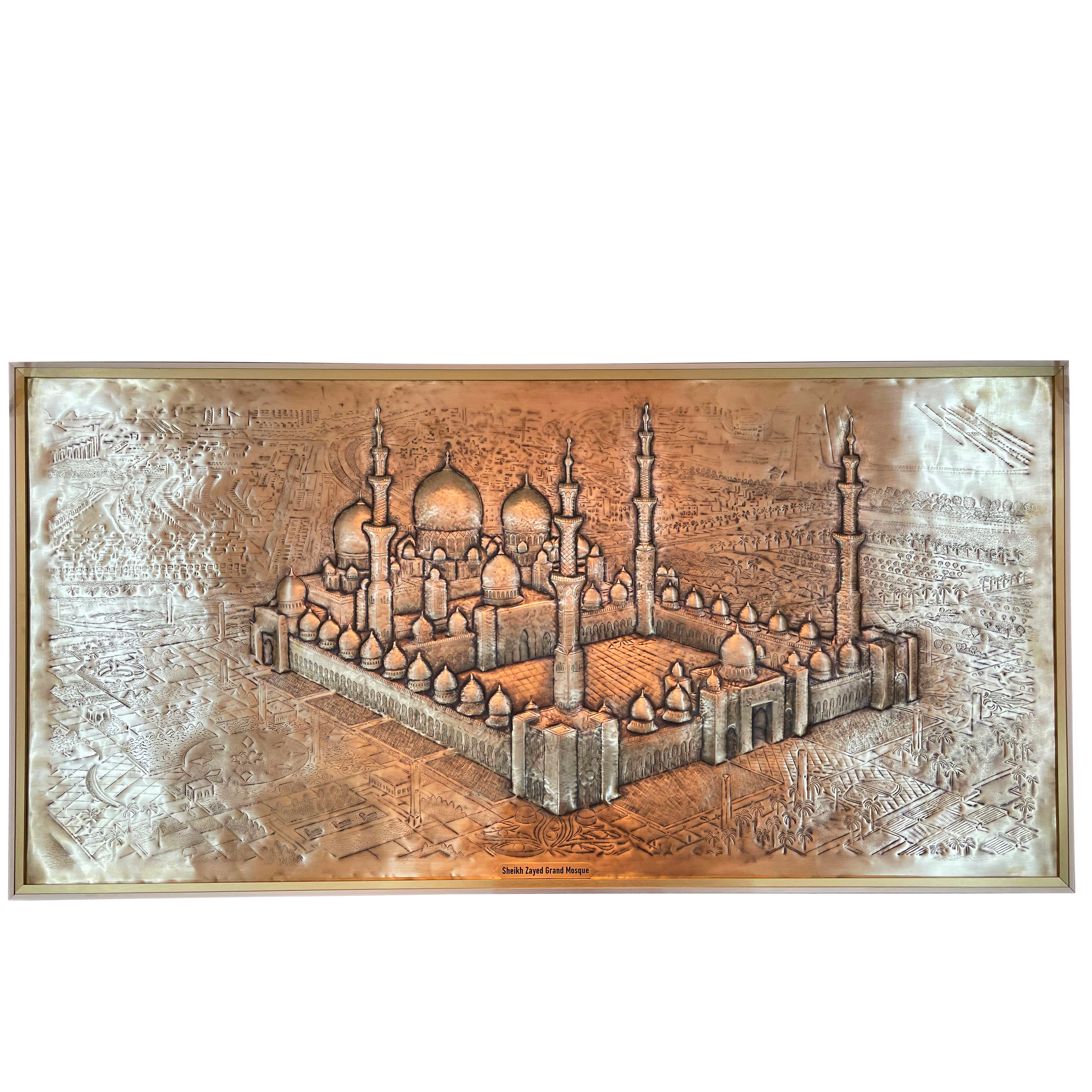 Memarlıq irsinin əzəmətindən ilhamlanaraq yaradılmış bu sənət nümunəsi, Şeyx Zayed Məscidinin klassik zərifliyini əks etdirir. Əsər latun materialdan ənənəvi döymə üsulu ilə, incə zövq və yüksək sənətkarlıq anlayışı əsasında hazırlanmışdır.