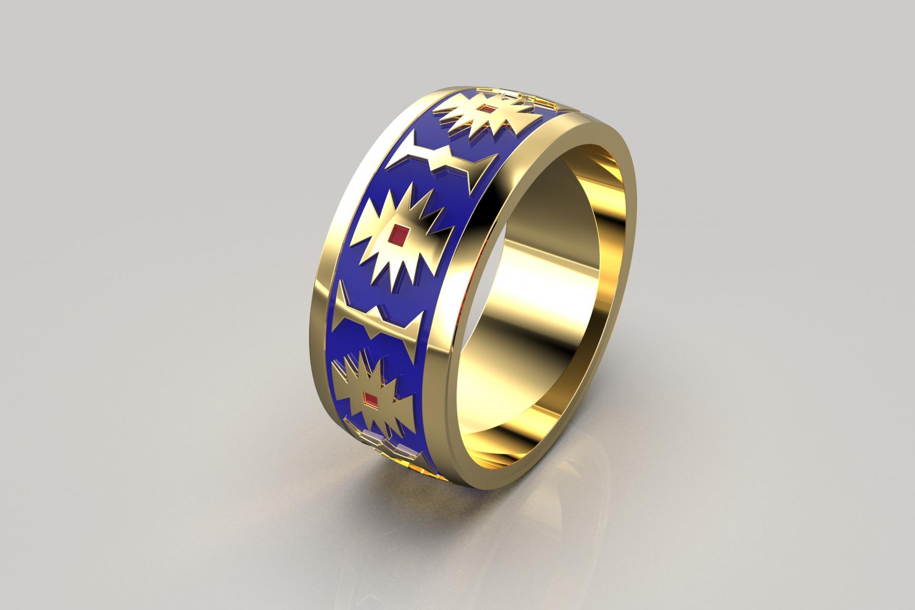 Gümüşdən hazırlanmış bu üzük Quba-Şirvan xalçaçılıq məktəbinin düyməli naxışı ilə bəzədilmişdir. Bu xalçalar mürəkkəb təsvirləri ilə və çoxlu miqdarda insan, quş və məişət təsvirləri ilə xarakterizə olunur. Onların kompozisiyasını, əsasən, qırmızı fona malik orta hissədə şaquli şəkildə yerləşən üç böyük səkkizguşəli medalyon təşkil edir.