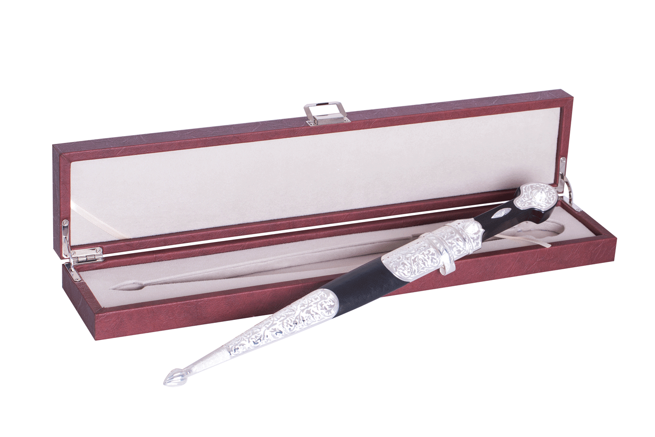 Этот серебряный кинжал, украшенный тонкими узорами, свидетельствует о традиционном азербайджанском искусстве и мастерстве. Тот факт, что это изделие сделано вручную, означает, что каждый узор и деталь тщательно продуманы. Этот боевой аксессуар, который на протяжении всей истории поддерживал выживание рыцарей в битвах, своей эстетикой придаст сил вашему духу в повседневной жизни.